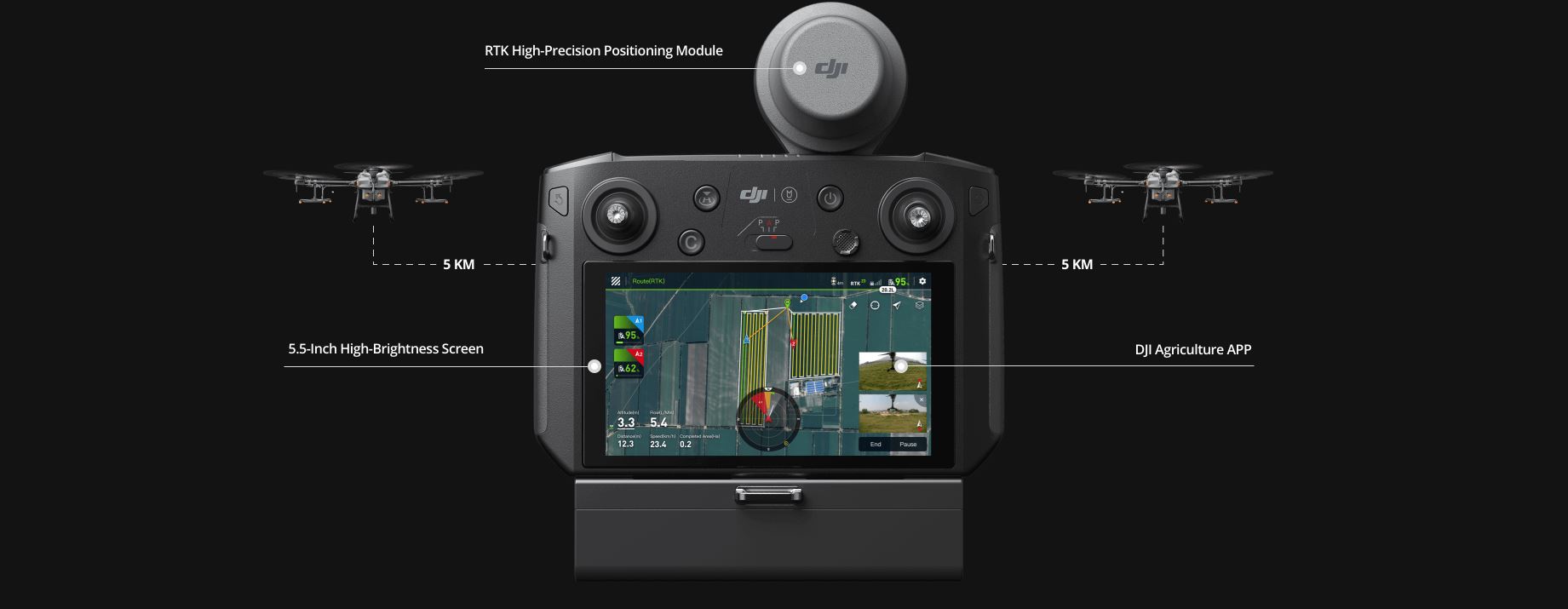 Un control remoto actualizado admite una transmisión de imagen estable desde una distancia de hasta 5 km, un 67% más que la generación anterior. [3] Una pantalla brillante de 5,5 pulgadas ofrece imágenes claras, incluso en condiciones de iluminación extremas. Para una mayor productividad, un control remoto puede operar varios drones a la vez. El módulo de posicionamiento de alta precisión RTK estándar implementa la planificación de operaciones a nivel de centímetros. Las mejoras adicionales incluyen una señalización más fuerte, antiinterferencias y estabilidad operativa. La nueva aplicación DJI Agriculture proporciona una experiencia de usuario fluida y un funcionamiento más intuitivo.